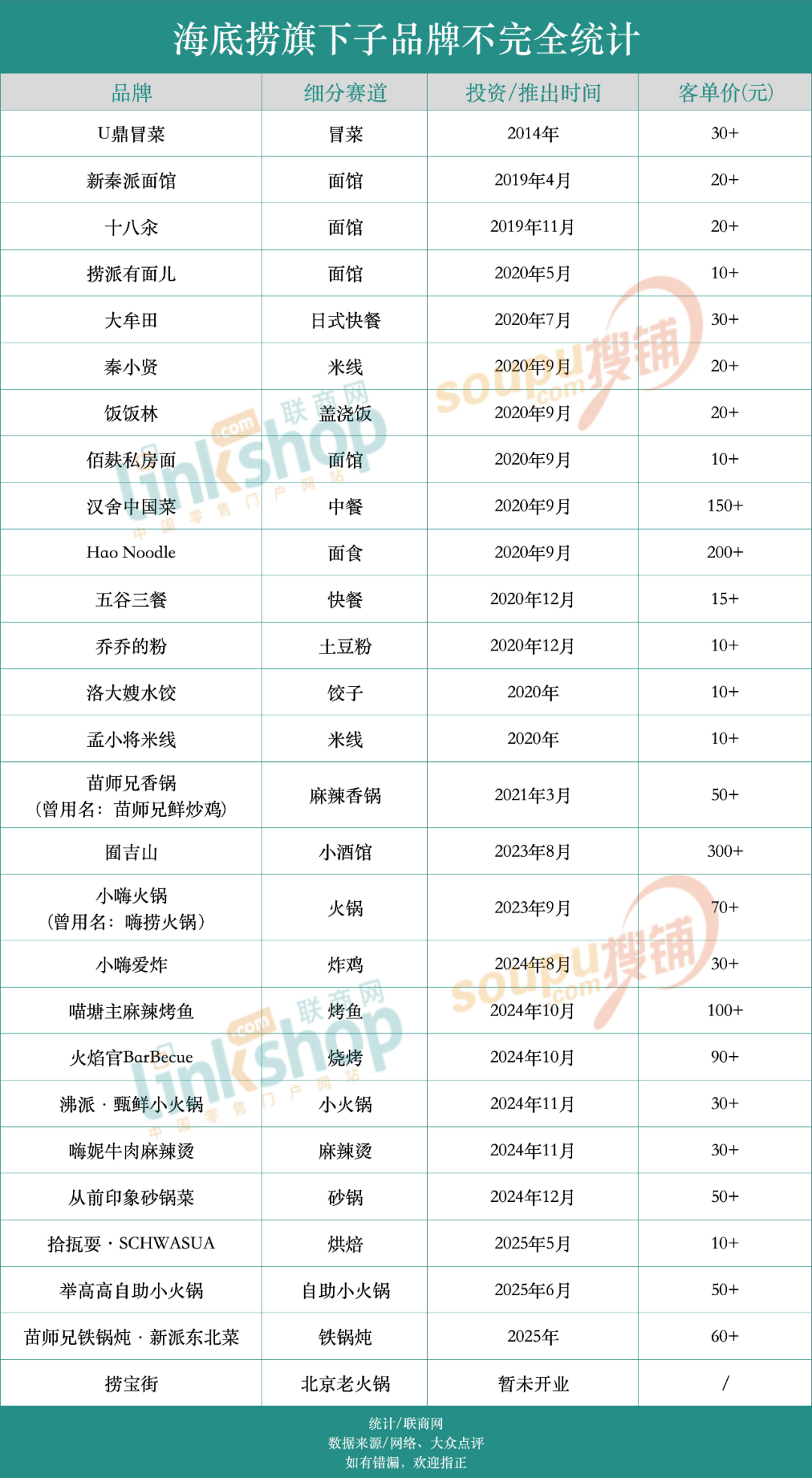 據(jù)聯(lián)商網(wǎng)不完全統(tǒng)計,2014年至今,海底撈通過內(nèi)部孵化和外部收購,共布局了27個餐飲品牌。但其中超半數(shù)已停業(yè),多數(shù)品牌存活時間不足1年。