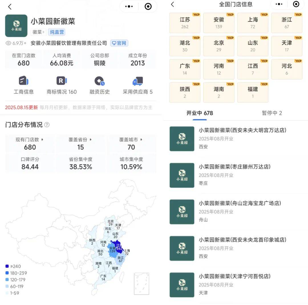 “窄門餐眼”8月15日更新的數(shù)據(jù)顯示,小菜園現(xiàn)有門店數(shù)680家,覆蓋15個省份,主要集中在江蘇和安徽;這意味著距離年底的不到五個月時間,至少要新開120家門店。