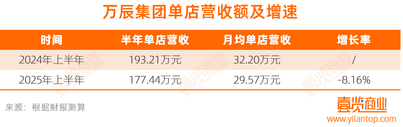 萬(wàn)辰集團(tuán)雖未透露其門店?duì)I收,不過(guò),根據(jù)門店的月均收入貢獻(xiàn)和加盟商所獲得毛利率倒推,2024年上半年,加盟門店月?tīng)I(yíng)業(yè)額約32.20萬(wàn)元,到2025年上半年則降至29.57萬(wàn)元,同比下降8.16%。且這一下滑趨勢(shì)與門店擴(kuò)張速度呈反向關(guān)系,拓店越快,單店收入被稀釋得越明顯。