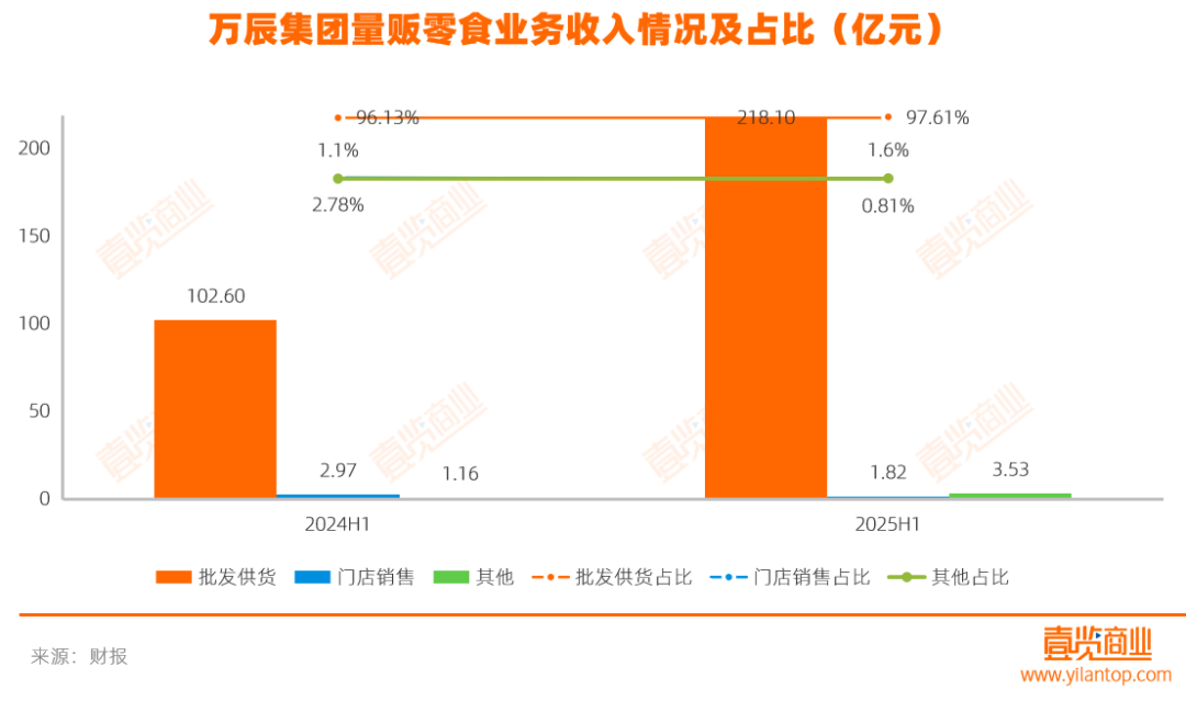 而量販零食業(yè)務(wù)的收入來(lái)源有三:批發(fā)供貨(也即向加盟商銷售產(chǎn)品)、門店銷售、其他。從財(cái)報(bào)數(shù)據(jù)看,這一業(yè)務(wù)的絕大部分收入源于給加盟商供貨。2025年上半年,萬(wàn)辰集團(tuán)通過(guò)向加盟商銷售產(chǎn)品獲得218.10億元的收入,同比增長(zhǎng)112.56%,占總營(yíng)收的96.58%。