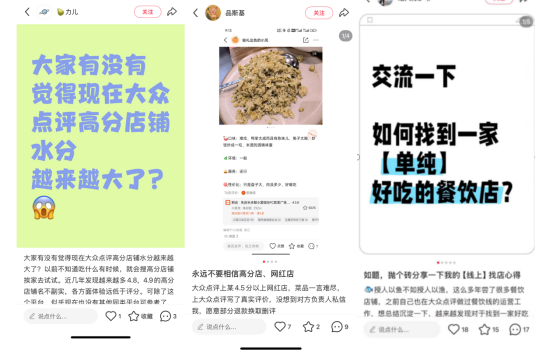 一方面,用戶吐槽“高分店鋪不好吃”的帖子滿天飛,清一色的4.5-5分餐廳已讓大眾審美疲勞,看起來(lái)十分“整齊劃一“的圖文點(diǎn)評(píng)更像是批量生產(chǎn),如何“找到一家【單純】好吃的餐飲店”已成為教科貼。