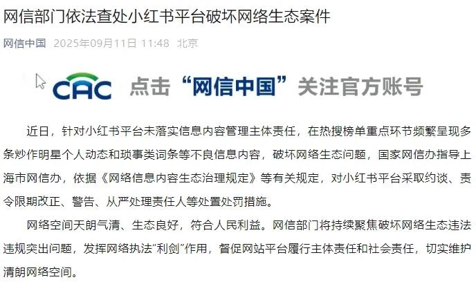 網(wǎng)信部門(mén)依法查處小紅書(shū)平臺(tái)破壞網(wǎng)絡(luò)生態(tài)案件-網(wǎng)信中國(guó)