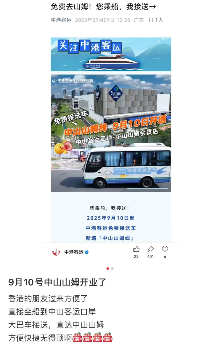 此外,源Sight還注意到,為了方便香港、澳門居民購物,中山的旅行社等機構(gòu)也借鑒了此前深圳、珠海等地的經(jīng)驗,開始陸續(xù)推出山姆門店往返中山客運口岸的專線。