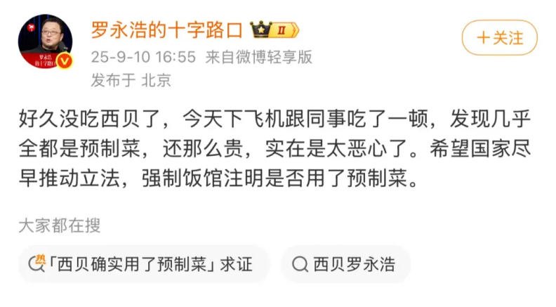 9月10日,羅永浩與四位同事在北京中糧祥云小鎮(zhèn)的西貝門店用餐,五人點(diǎn)了13道菜。餐后,他在微博吐槽:“好久沒吃西貝了,今天下飛機(jī)跟同事吃了一頓,發(fā)現(xiàn)幾乎全都是預(yù)制菜,還那么貴,實(shí)在是太惡心了!蓖瑫r(shí),他呼吁國家盡早推動立法,強(qiáng)制飯館注明是否用了預(yù)制菜。此微博迅速引發(fā)熱議,話題#羅永浩吐槽西貝#閱讀量飆升至數(shù)千萬。