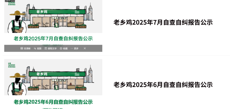 此外,老鄉(xiāng)雞還主動披露預(yù)制菜的占比及詳情,打破信息差。它會在官網(wǎng)、公眾號等多個渠道,向社會公開預(yù)制菜的菜品占比——明確告知消費(fèi)者復(fù)熱類菜品僅占1.7%,僅有兩道,分別是筍干燒肉和秘制扣肉飯,其余菜品均為現(xiàn)做或半預(yù)制;且每個月會發(fā)布自查自糾報(bào)告,披露菜品制作過程中存在的問題及整改情況,進(jìn)一步提升透明度。