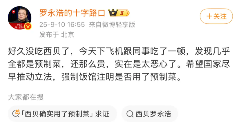 一夜之間,羅永浩、連鎖餐飲品牌西貝莜面村(以下簡稱“西貝”)和預(yù)制菜一起承包了微博熱搜。