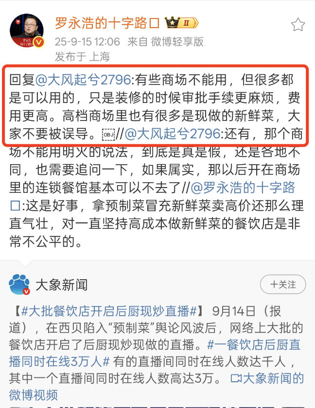 先看羅永浩的回答,他對網(wǎng)友進行了科普:“有些商場不能用,但很多都是可以用的,只是裝修的時候?qū)徟掷m(xù)更麻煩,費用更高。高檔商場里也有很多是現(xiàn)做的新鮮菜”。