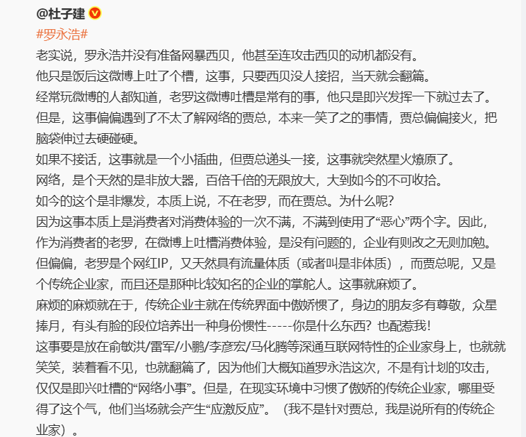 新浪微博“大V”杜子建說:“羅永浩并沒有準備網暴西貝,他甚至連攻擊西貝的動機都沒有。他只是飯后在微博上吐了個槽,這事,只要西貝沒人接招,當天就會翻篇!