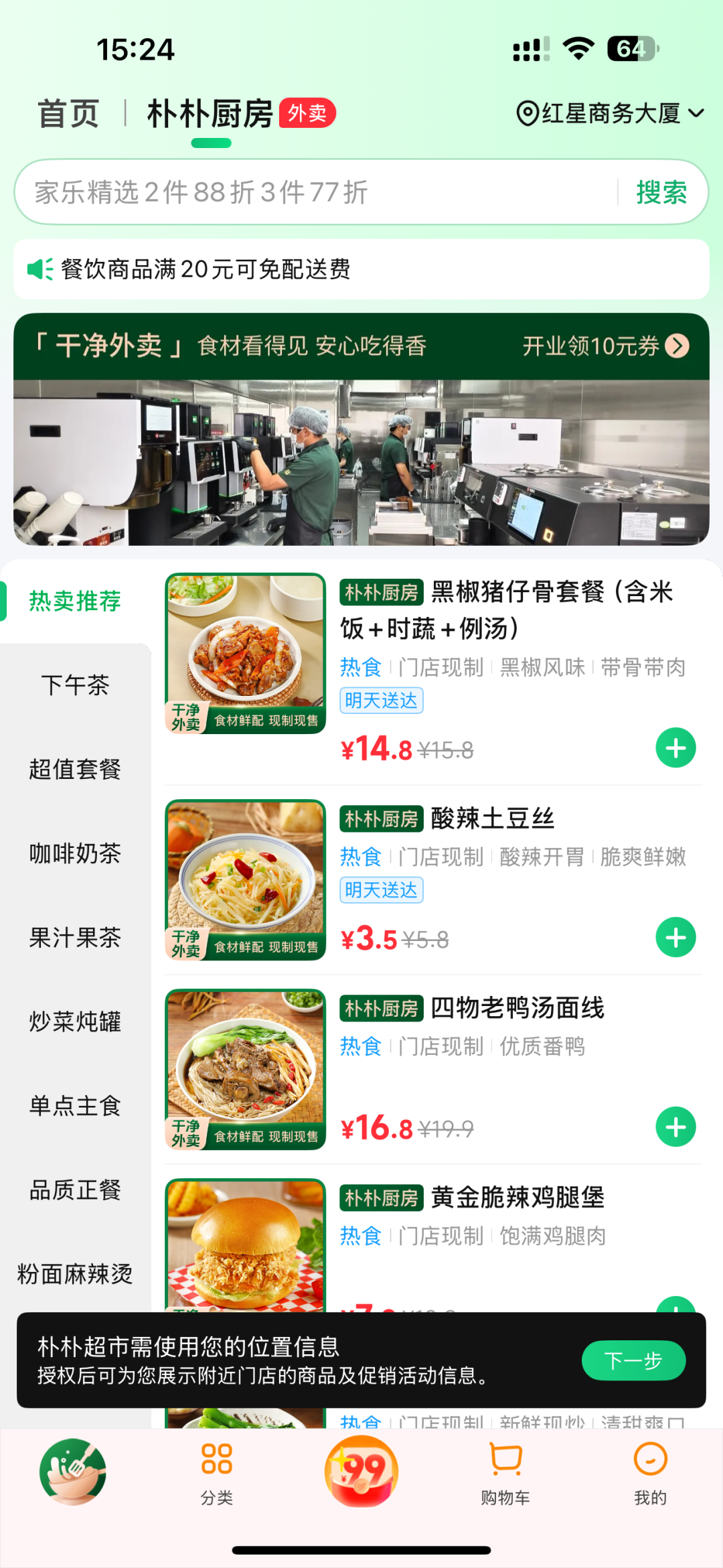 不過這只是其目前小范圍的內測,在最新版“樸樸超市App”里,只要將地址改為福州的紅星商務大廈,即可看到首頁的Tab按鈕——樸樸廚房(外賣)。