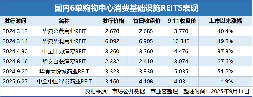 從目前已入市的6單購物中心REITs二級(jí)市場(chǎng)表現(xiàn)來看,價(jià)格基本處于上漲趨勢(shì),其中華夏大悅城商業(yè)REIT漲幅最高,超50%,而華夏金茂商業(yè)REIT、華夏華潤商業(yè)REIT漲幅均超過40%。