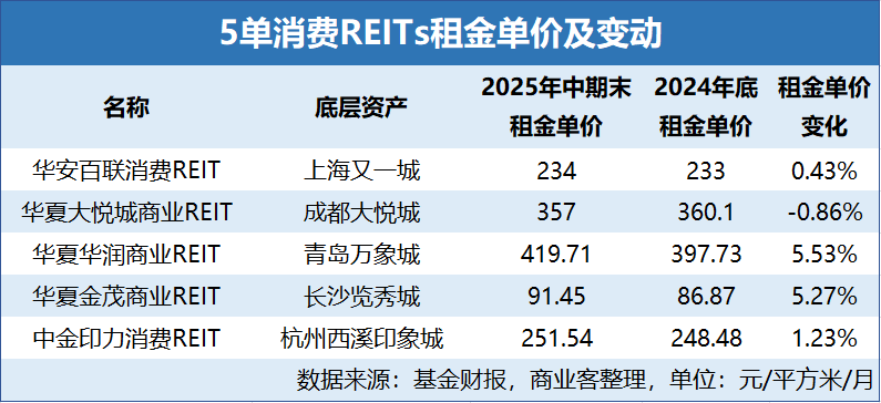 若從租金單價(jià)變化方面來看,上半年除成都大悅城的租金單價(jià)有小幅的0.86%下滑外,其余5個(gè)底層資產(chǎn)的租金單價(jià)均實(shí)現(xiàn)上漲,其中華夏華潤商業(yè)REIT的青島萬象城漲幅最高,由2024年底的397.73元/平方米/月,漲至2025年6月底的419.71元/平方米/月,漲幅為5.53%。