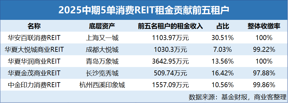 其中,租戶集中度較低的是成都大悅城,單一租戶占比均未超過5%,前五名租戶的租金收入占比總計(jì)7.03%,不超過10%。