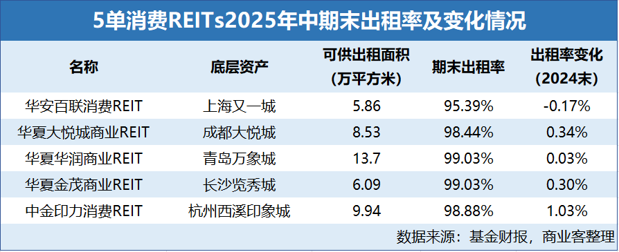 除并未披露半年財(cái)報(bào)的中金中國綠發(fā)商業(yè)REIT,從出租率指標(biāo)來看,其余5只消費(fèi)REITs的底層購物中心資產(chǎn)均在95%以上。其中,青島萬象城和長沙覽秀城的出租率最高,達(dá)到99.03%;除上海又一城出租率較2024年末有所下降外,其余購物中心的出租率均實(shí)現(xiàn)小幅上漲。