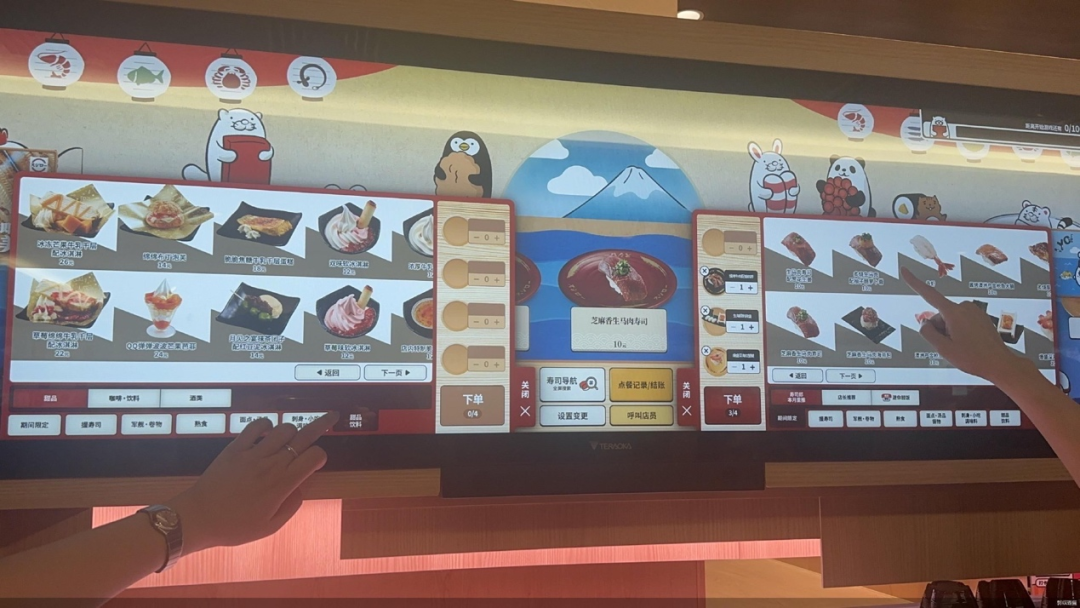 從體驗(yàn)感看,這兩家回轉(zhuǎn)壽司沒再走過去普通傳送帶、一道菜傳遍所有人的老路。消費(fèi)者通過平板電腦或者超大屏幕,在琳瑯滿目的上百種產(chǎn)品中選好菜下單,后廚會即點(diǎn)即做,再用專門的傳送帶,把菜剛剛好好送到他們的面前,并配上一段提醒菜已送達(dá)的BGM,儀式感直接拉滿。
