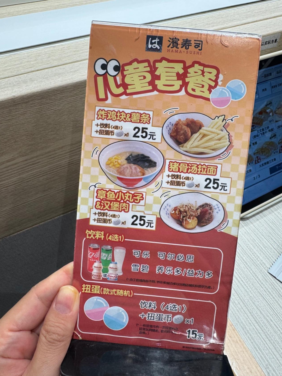 相比上一代連鎖日料,壽司郎和濱壽司在服務(wù)家庭人群上還搞了新花樣。比如它們都強(qiáng)調(diào)食材新鮮和門店現(xiàn)做,解決了家庭客最關(guān)注的安全牌問題,壽司郎的消費(fèi)者也已經(jīng)自行在社交網(wǎng)絡(luò)上總結(jié)了「非生食菜單」,來滿足腸胃較弱的孩子、老人和孕婦的需求。而濱壽司則有自己的兒童套餐,一份兼顧碳水和蛋白質(zhì)、并配了飲料的套餐只要25元,還會附贈一枚「扭蛋幣」,讓小孩子或者kidult能在扭蛋機(jī)前開心一下,就餐也就有了迪士尼的娛樂感。