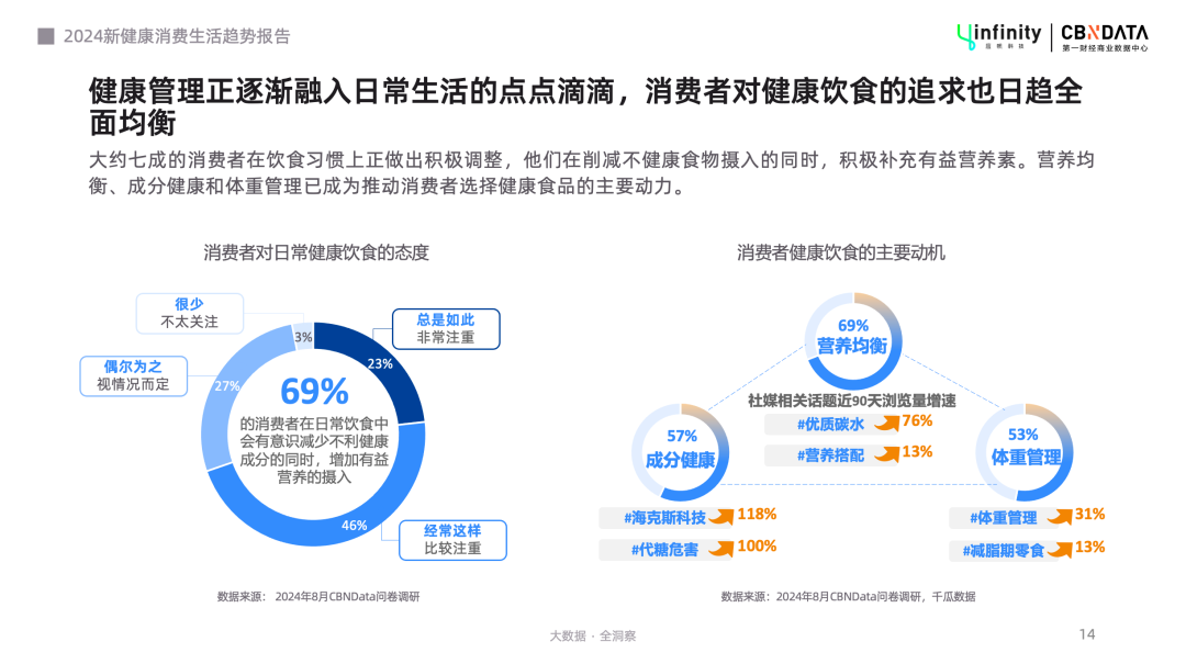 CBNData發(fā)布的《健康產(chǎn)業(yè)消費趨勢發(fā)展報告》顯示,2024年,69%的受訪者在日常飲食中有意識減少不利健康成分的同時,增加有益營養(yǎng)的攝入。低門檻、輕負(fù)擔(dān)、愉悅性等積極體驗,已成健康消費的重要價值之一。