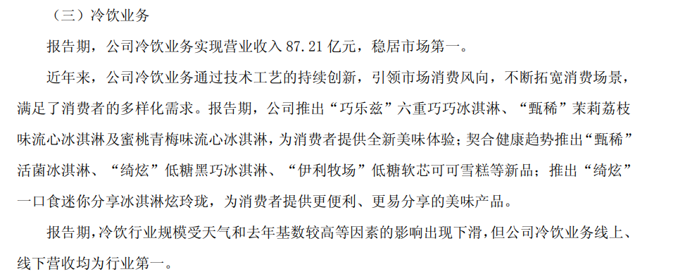 一般而言,消費者更傾向于在炎熱夏季選購冷凍飲品,進(jìn)入寒冷的秋冬季后,對這類產(chǎn)品的購買意愿會顯著降低。比如,2024年財報顯示,伊利冷飲業(yè)務(wù)營收87.21億元,同比驟降18.4%,主要系“天氣和去年基數(shù)較高等因素的影響”。