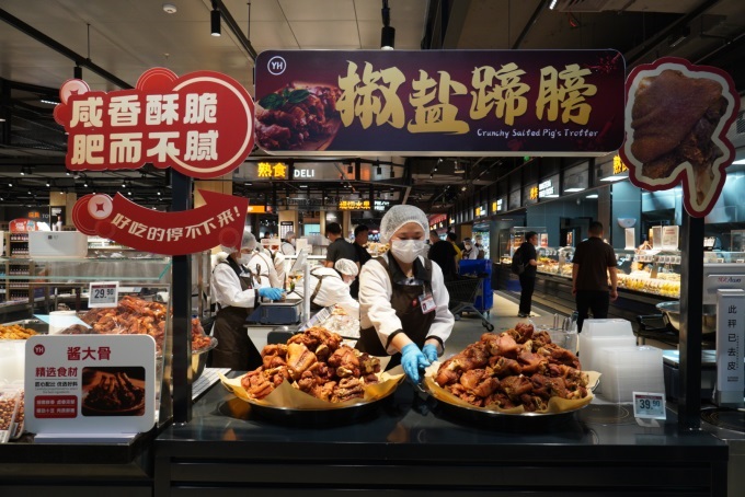 熟食區(qū)聘請專業(yè)廚師團隊,推出避風(fēng)塘皮皮蝦、糖炒栗子、蒲燒鰻魚、涼拌葷菜、撈汁海鮮、下酒菜系列;引入上海山林熟食,同步上線臘牛肉、醬牛肉等傳統(tǒng)大單品;合作東來供應(yīng)商推出九多肉多豬蹄、雙匯甜腸;并為年輕客群提供雨潤烤雞、洽禾韓式炸雞、周黑鴨鴨附產(chǎn)品,以及肉蛋堡、現(xiàn)烤披薩、現(xiàn)蒸饅頭等多元選擇。
