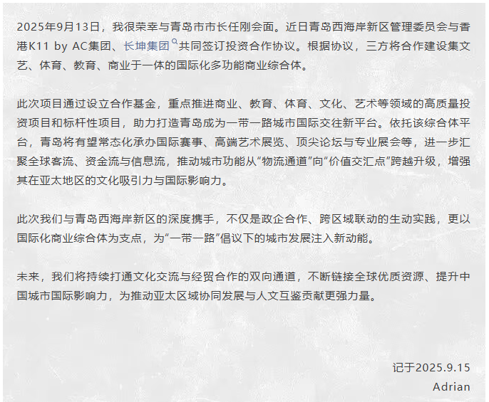 香港鄭裕彤家族成員、K11創(chuàng)辦人鄭志剛,近日在多個社交媒體賬號發(fā)布了一則動態(tài)——青島西海岸新區(qū)管理委員會與香港K11 by AC集團(tuán)、長坤集團(tuán)共同簽訂投資合作協(xié)議。