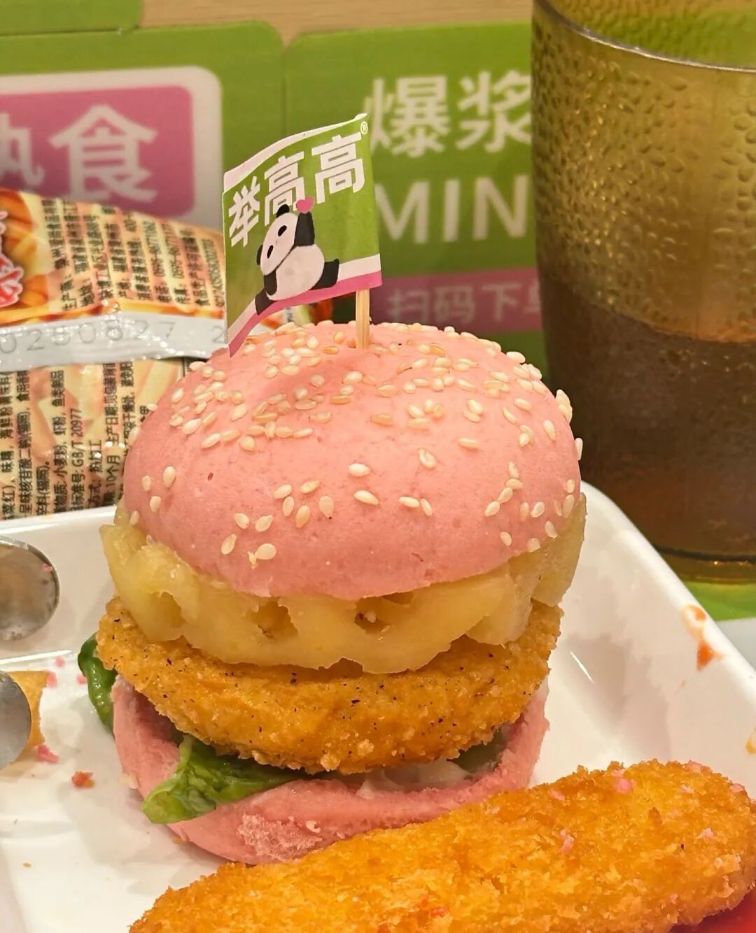 或許是為了與健康賣點相互呼應,并降低品牌認知成本,舉高高還將熊貓設計成品牌IP,為此門店設置了帶有粉色腮紅的熊貓立牌、熊貓周邊,以及各類熊貓裝飾等。