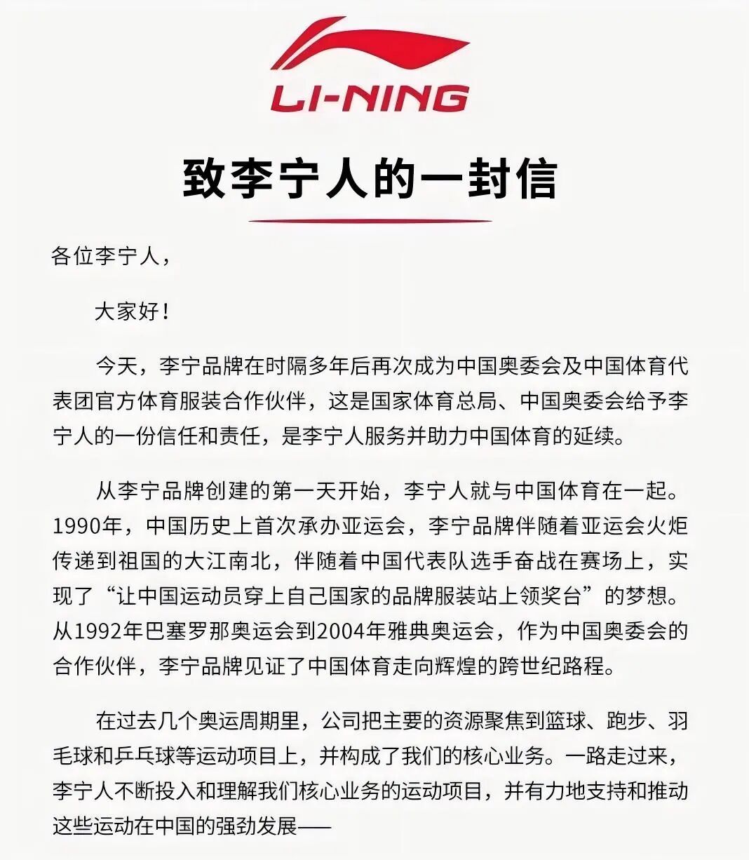今年1月15日,上海聯(lián)交所正式發(fā)布公告,宣布李寧接替安踏,成為2025-2028年中國奧委會及中國體育代表團官方體育服裝合作伙伴,創(chuàng)始人李寧罕見對內(nèi)發(fā)布《致李寧人的一封信》,信中寫道:“希望每一個李寧人都能自豪地接受這份榮譽和使命。”