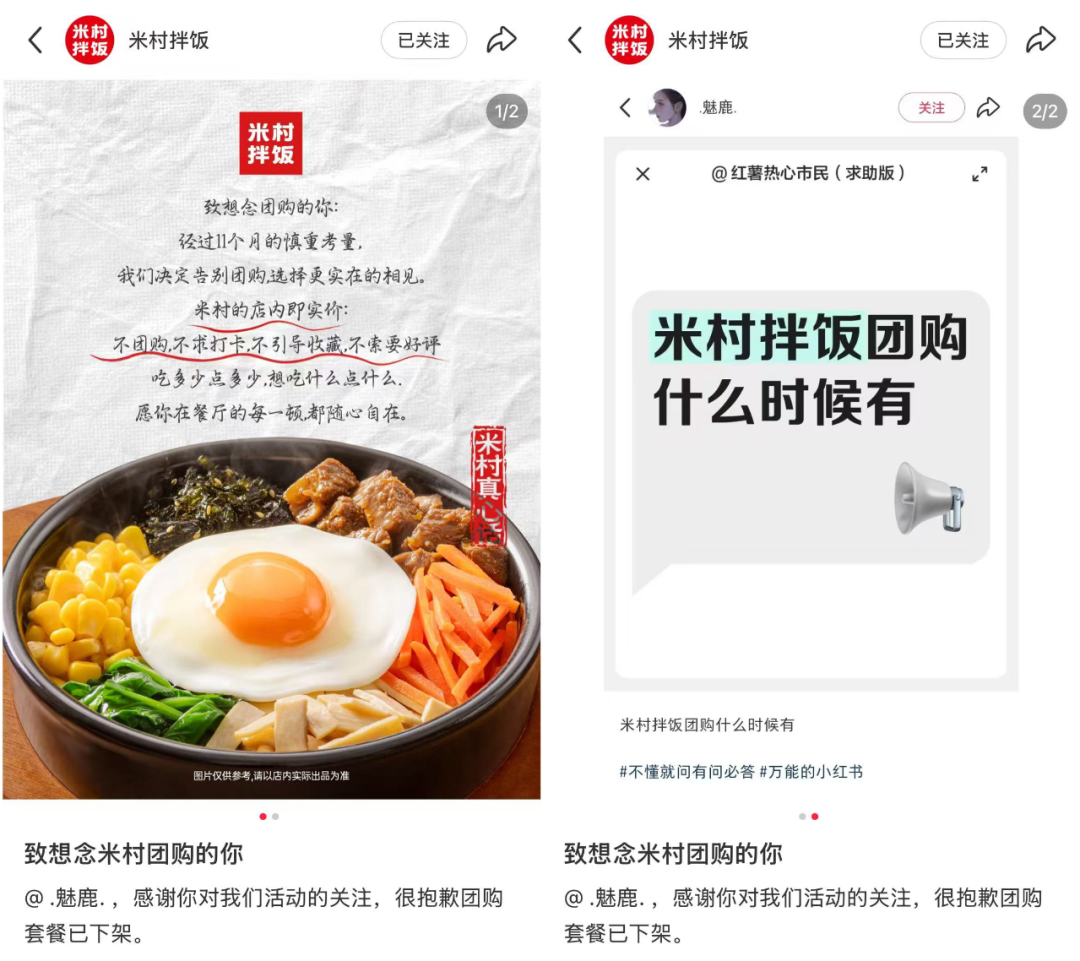 近日,米村拌飯?jiān)谏缃黄脚_(tái)發(fā)布了一則聲明,標(biāo)題直白:“致想念米村團(tuán)購(gòu)的你。”在這份聲明中,品牌用頗為鄭重的語(yǔ)氣寫(xiě)道: