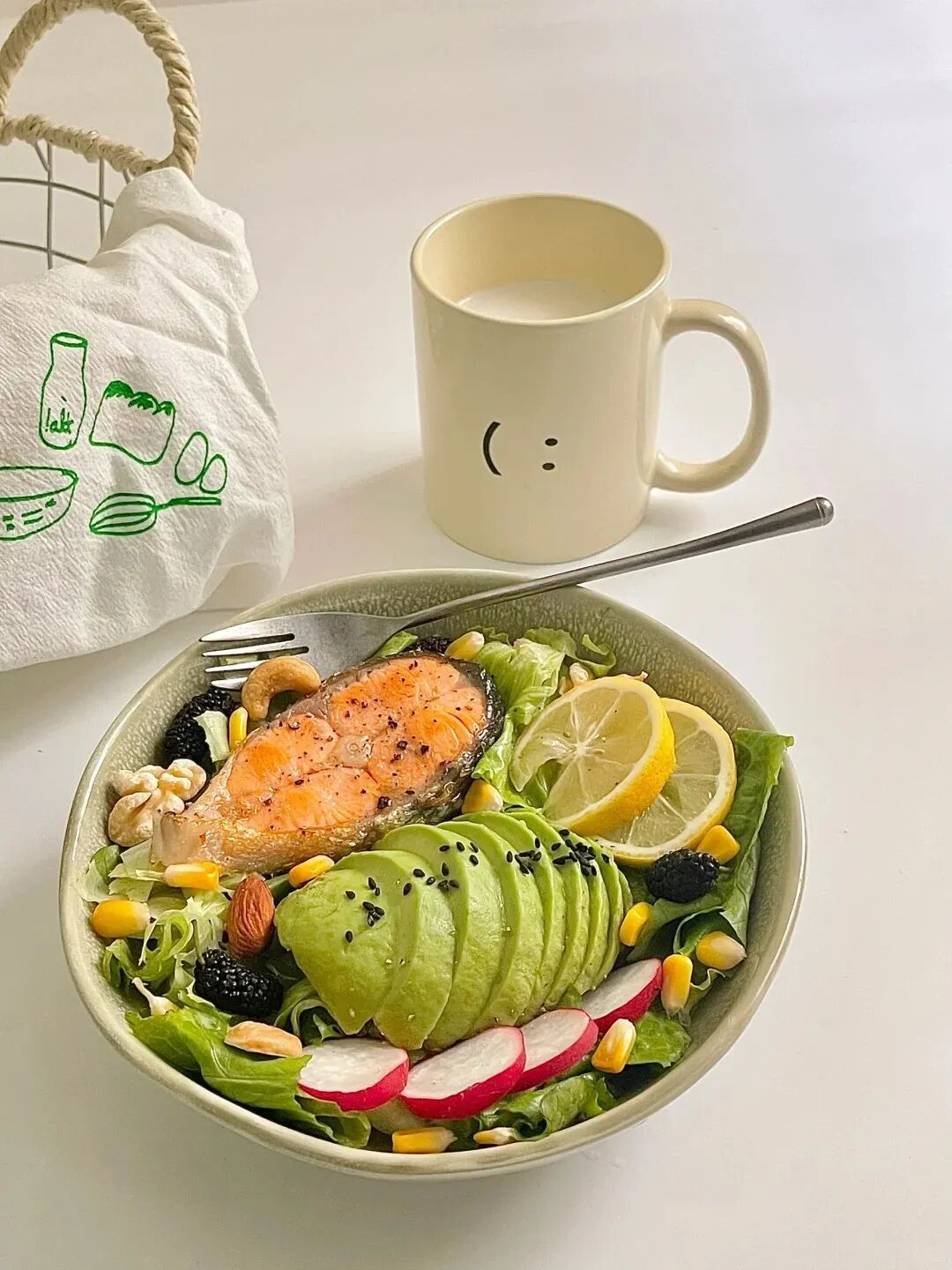 (左)三文魚牛油果玉米沙拉 ?圖源小紅書 @愛吃肉肉