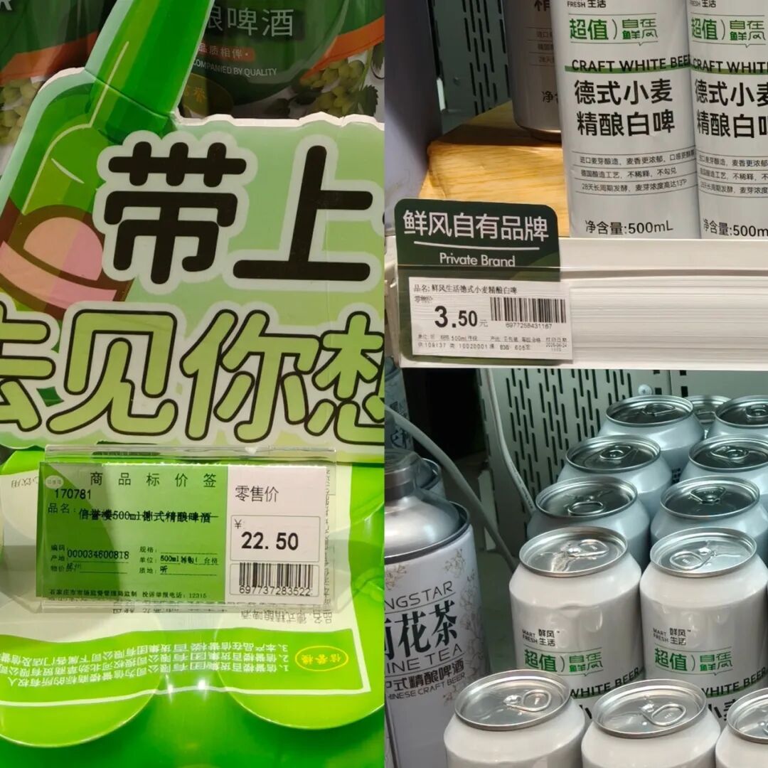 還有很常見的商超自營(yíng)精釀啤酒,信譽(yù)樓自營(yíng)的500ml*6一組的德式精釀啤酒售價(jià)22.5元,單價(jià)約3.75元;相比之下,胖東來DL德式小麥白啤500ml一瓶3.9元、鮮風(fēng)生活超值德式精釀小麥啤酒500ml一瓶3.5元。