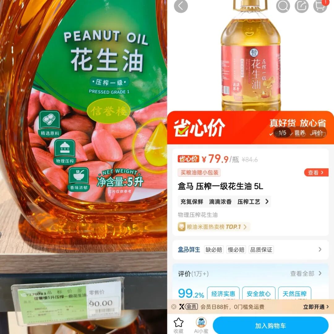 以信譽(yù)樓亞麻籽油為例,5L一桶售價(jià)119元,對(duì)比盒馬MAX的有機(jī)亞麻籽油5L一桶售價(jià)110.9元;還有信譽(yù)樓的壓榨一級(jí)花生油5L一桶售價(jià)90元,對(duì)比盒馬自營(yíng)的同款商品售價(jià)79.9元。