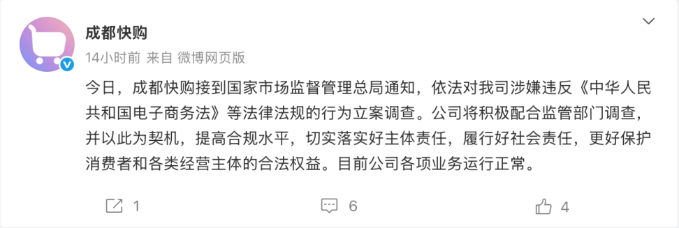 隨后,成都快購科技有限公司通過官博迅速做出回應(yīng)稱,公司將積極配合監(jiān)管部門調(diào)查,并以此為契機(jī),提高合規(guī)水平,切實落實好主體責(zé)任,履行好社會責(zé)任,更好保護(hù)消費(fèi)者和各類經(jīng)營主體的合法權(quán)益。目前公司各項業(yè)務(wù)運(yùn)行正常。