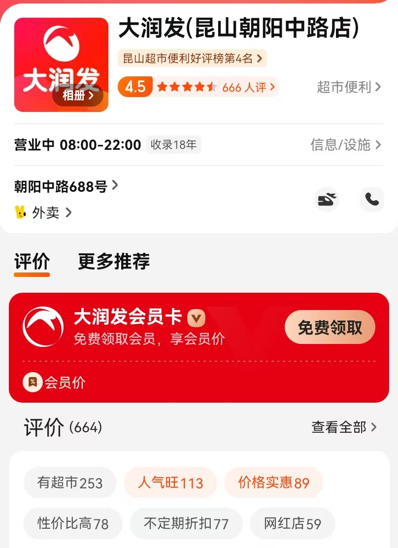 對(duì)大潤(rùn)發(fā)來(lái)說(shuō),早前昆山店及自身品牌口碑尚可。美團(tuán)666條評(píng)價(jià)(7條針對(duì)新店),綜合評(píng)分4.5分,表現(xiàn)還算比較優(yōu)秀。