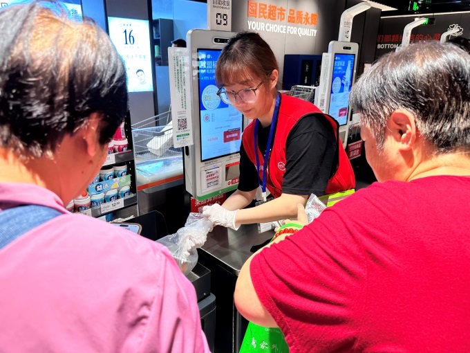 細節(jié)服務彰顯溫度:食品貨架配備放大鏡,方便老年顧客閱讀信息;連卷袋配備濕手器,解決手濕難撕袋問題;冷鏈區(qū)域配備防凍手套,海鮮區(qū)提供防刺手套;果切組合按甜度標注食用順序,購買整個西瓜、榴蓮等可享免費剝切服務。