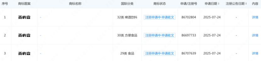企查查顯示,武漢中百便利店有限公司自2023年6月開始注冊“百嶼森”商標,今年7月更是密集申請。