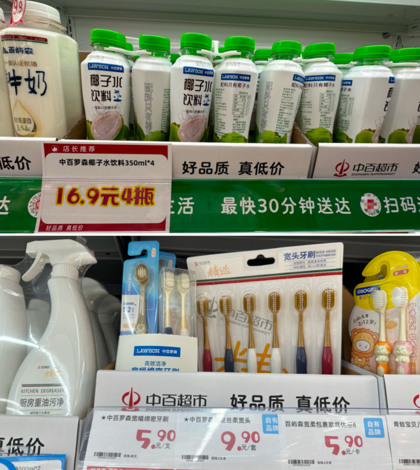 因此,我們能夠在中百超市硬折扣店內看到多款“中百羅森”商品。如中百羅森椰子水飲料350ml售價16.9元4瓶,中百羅森寬幅棉密絲柔寬頭牙刷5.9元/支等。