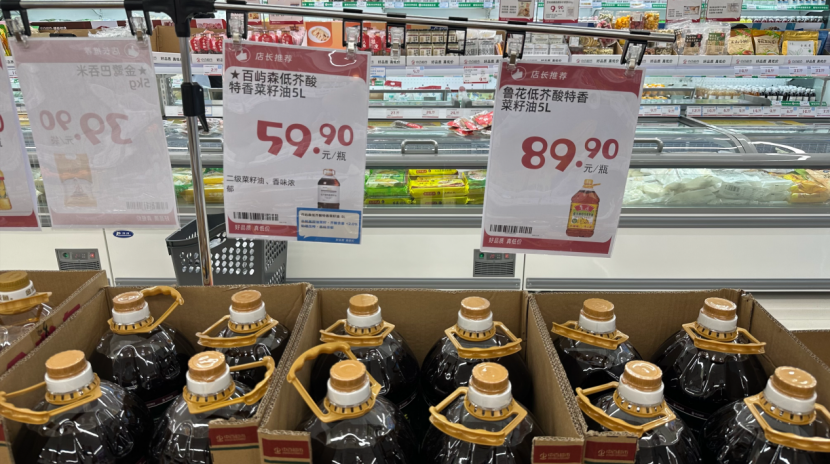 陳列技巧上,將自有品牌與一線品牌比鄰陳列,如59.9元/瓶的“百嶼森”5L菜籽油緊鄰89.9元/瓶的魯花同類型產品,形成直觀價格對比。