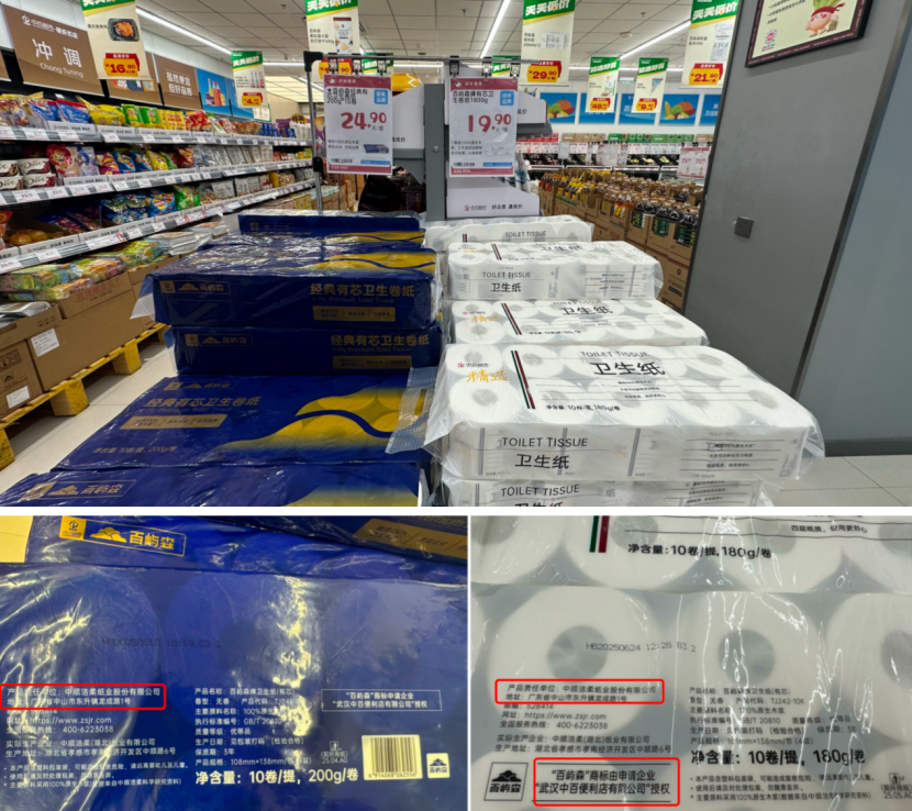 筆者觀察到,部分“百嶼森”商品采用大品牌代工模式,如售價19.9元/提與24.9元/提的兩款衛(wèi)生卷紙,實際生產企業(yè)均為中順潔柔(湖北)紙業(yè)有限公司,其商品包裝袋上還注明了:“百嶼森”商標由申請企業(yè)“武漢中百便利店有限公司”授權。