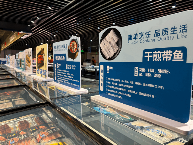 在顧客服務(wù)方面,門(mén)店的服務(wù)細(xì)節(jié)亦盡顯匠心。水產(chǎn)品現(xiàn)撈瀝水,包裝袋除皮;設(shè)有防凍、防扎手套,連卷袋濕手器;收銀臺(tái)為顧客提供一次性用品(筷子、勺子、叉子、吸管等)。店內(nèi)還有商品介紹、挑選技巧、烹飪菜單等一系列的主題卡片和溫馨提示,為顧客提供極大便利。
