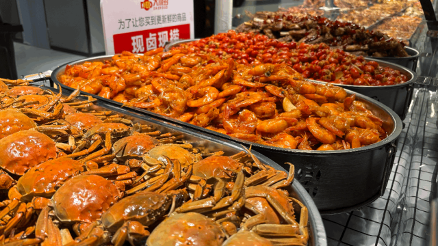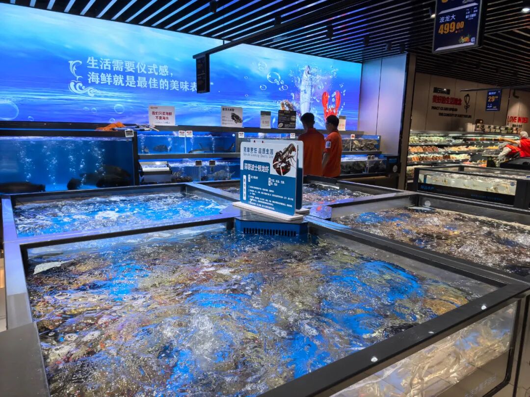 在水產(chǎn)區(qū),商品組合非常豐富,更加注重品質(zhì)。這里有599元/只的澳龍、499元/只的波龍、299元/斤的帝王蟹、188元/斤的波龍、249元/斤的珍寶蟹、149元/斤的面包蟹等品質(zhì)之選,也有鱖魚(yú)、鱸魚(yú)、多寶魚(yú)、生蠔、基圍蝦等極致性?xún)r(jià)比之選。