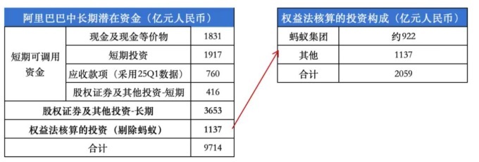 第二個(gè)層次對(duì)應(yīng)資金約9714億元:截至2025上半年,阿里巴巴長(zhǎng)期股權(quán)證券及其他投資3653億元,權(quán)益法核算的投資約1137億元(剔除螞蟻),長(zhǎng)期投資合計(jì)4790億元,公司在長(zhǎng)周期可動(dòng)用的最大資金量9714億元,近萬(wàn)億元。