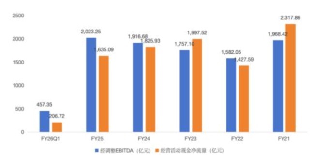 拉長(zhǎng)周期看,阿里巴巴FY21-FY25(即2021財(cái)年到2025財(cái)年)的經(jīng)調(diào)整EBITDA、經(jīng)營(yíng)活動(dòng)凈現(xiàn)金流總額基本接近,均為9200多億元。但由于經(jīng)調(diào)整EBITDA排除了應(yīng)收賬款、應(yīng)付賬款、存貨短期變動(dòng)對(duì)現(xiàn)金流的影響,因此對(duì)阿里巴巴而言,經(jīng)調(diào)整EBITDA是一個(gè)更穩(wěn)定的觀測(cè)指標(biāo)。