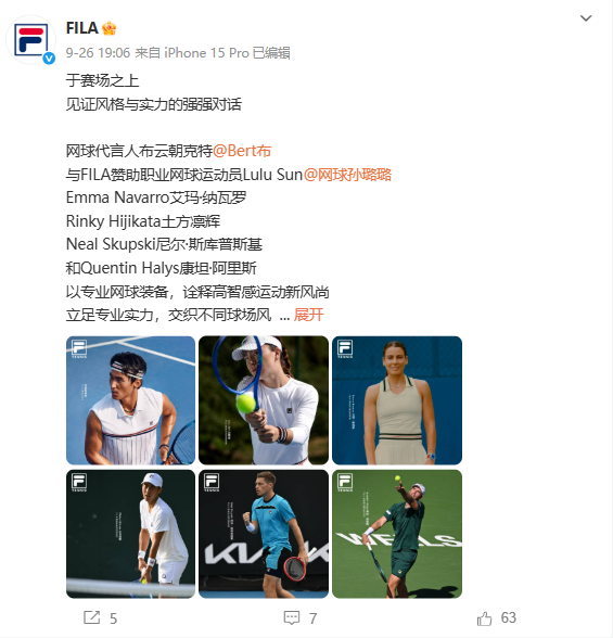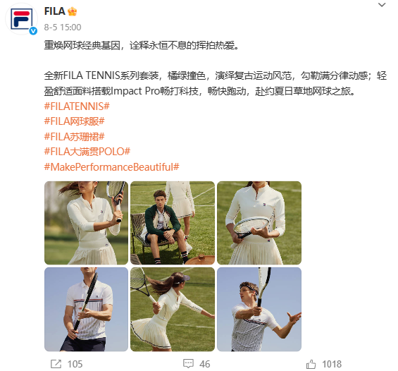 起源于貴族運動的網球,一直有著高端、時尚的屬性,這與FILA主推的運動時尚風相契合。而FILA通過與網球的綁定,也奠定了其在該領域的基調。