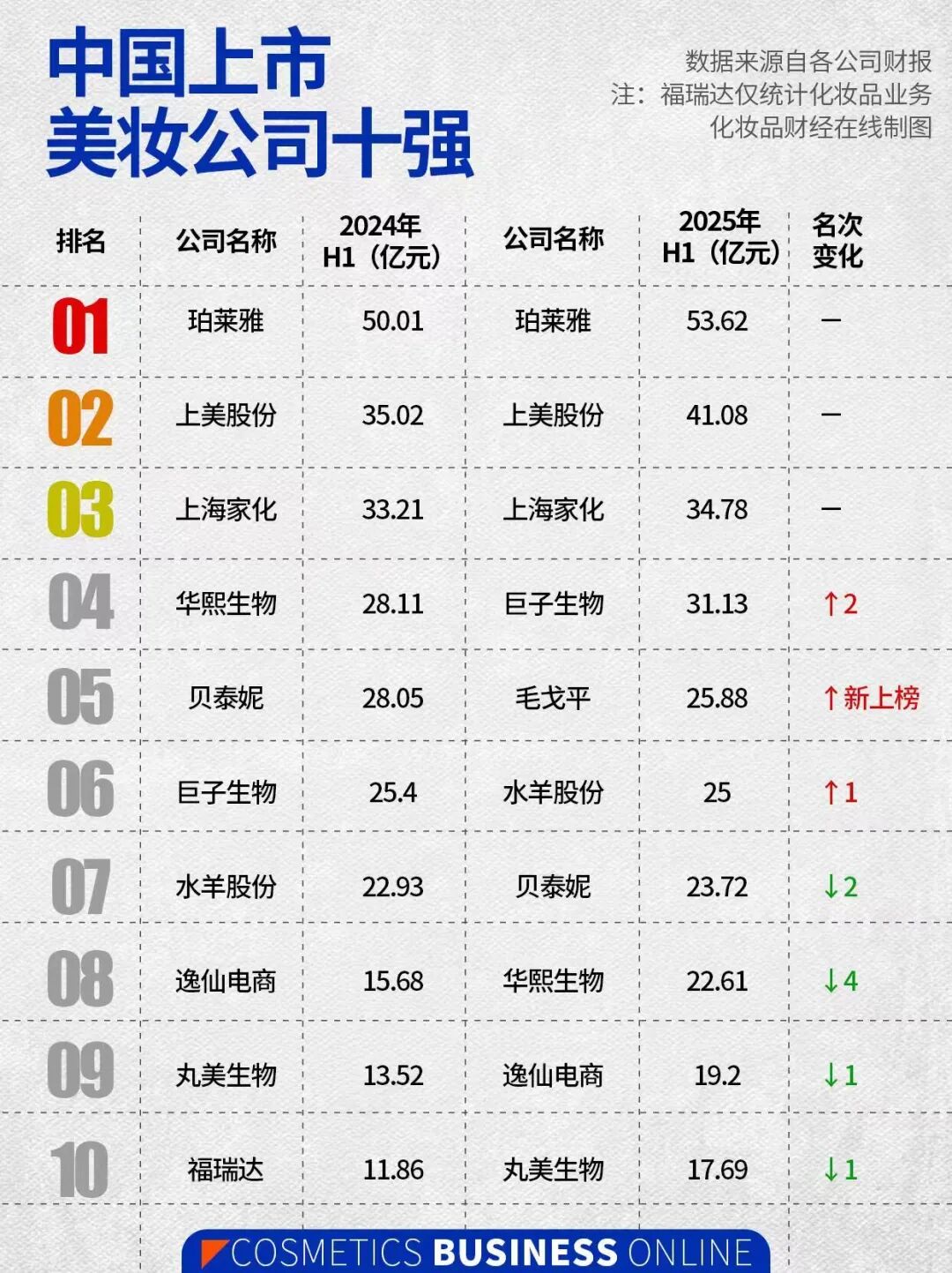 另據(jù)“CBO化妝品財經(jīng)在線”統(tǒng)計數(shù)據(jù),2025年上半年國貨美妝上市企業(yè)前十強總營收增長11.72%。珀萊雅、上美股份、上海家化依舊穩(wěn)居前三甲。