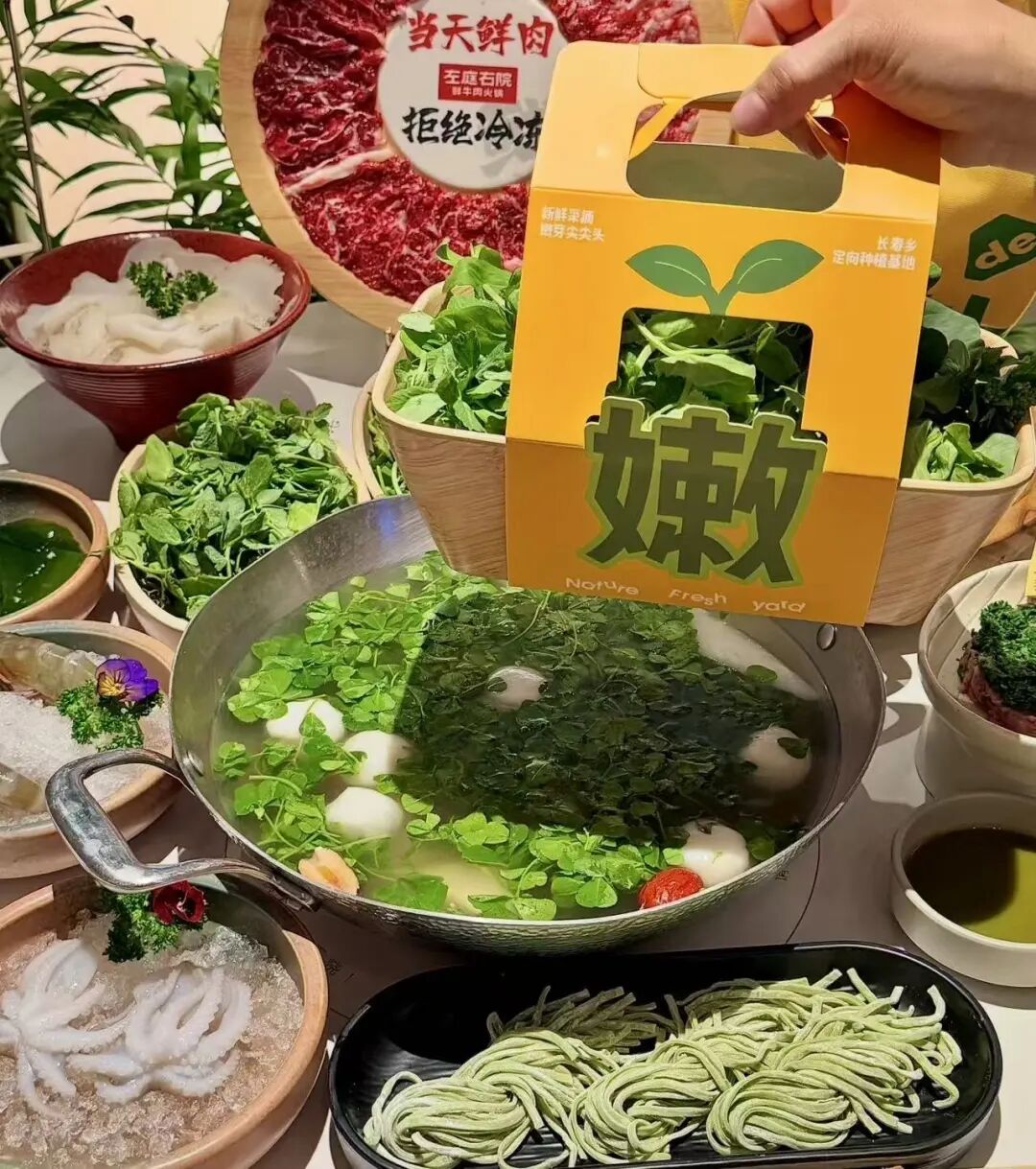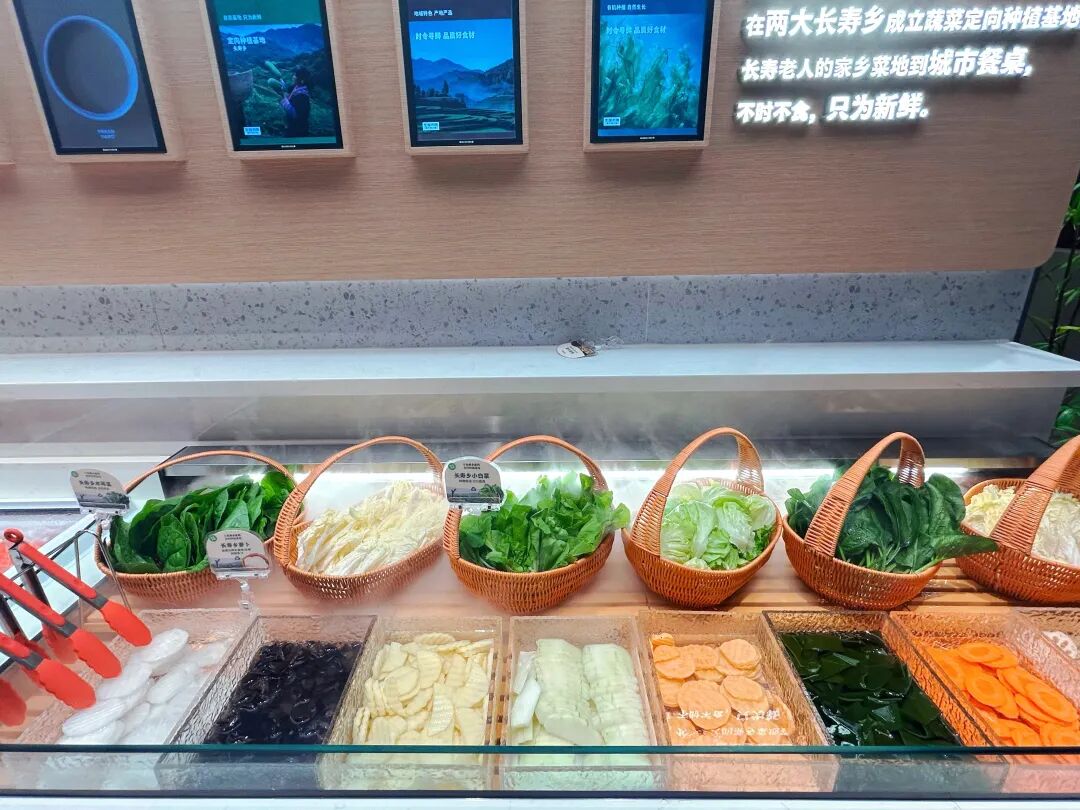 首先,以 “長壽鄉(xiāng)” 概念賦予健康光環(huán)。品牌跳出常規(guī)蔬菜選項,選擇了十余款具有天然健康認知的特色食材,如源自 “世界長壽之鄉(xiāng)” 的南通如皋蘿卜、廣西巴馬冬瓜等,從而提升菜品的獨特性,為自助模式疊加稀缺的健康價值。