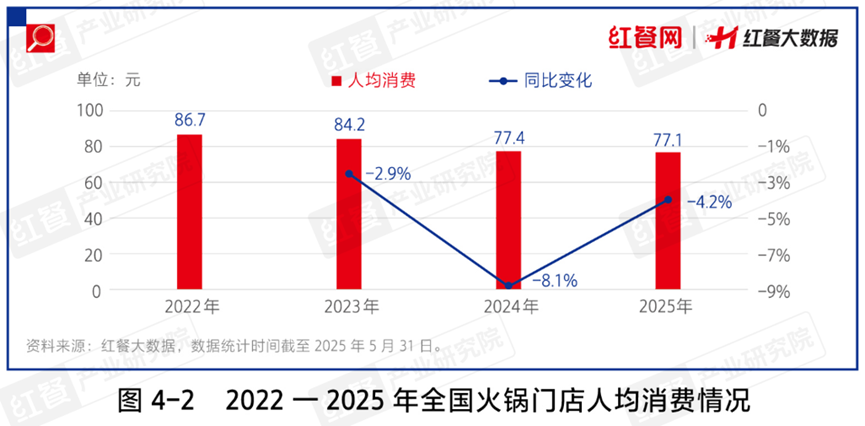 《中國(guó)餐飲發(fā)展報(bào)告2025》顯示,截至2025年5月,全國(guó)火鍋門(mén)店總數(shù)已經(jīng)超過(guò)49萬(wàn)家,人均消費(fèi)價(jià)格也從過(guò)去的80+元區(qū)間降到了70+元。