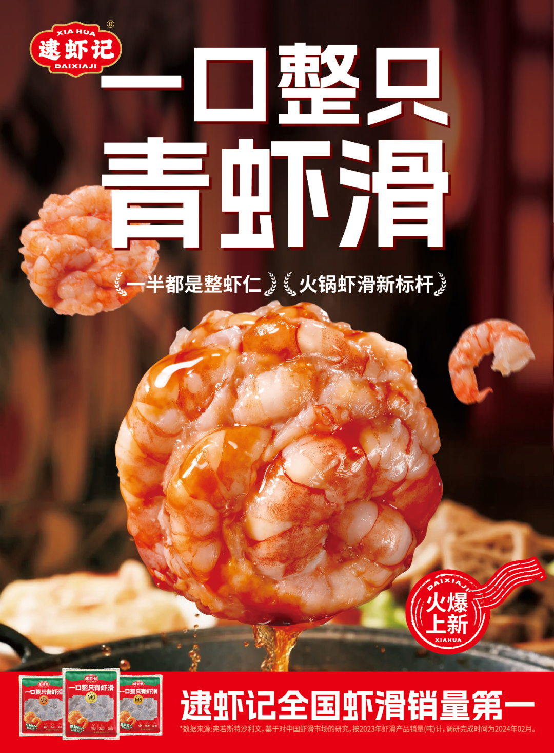 逮蝦記自成立以來(lái)便專(zhuān)注于蝦滑類(lèi)產(chǎn)品,2021年,逮蝦記率先在行業(yè)內(nèi)提出蝦滑的“顆!备拍,并推出大顆粒蝦滑類(lèi)產(chǎn)品,憑借肉量足、蝦肉顆粒飽滿、口感彈滑、價(jià)值感強(qiáng)等優(yōu)點(diǎn),受到大批火鍋商家店及消費(fèi)者青睞。