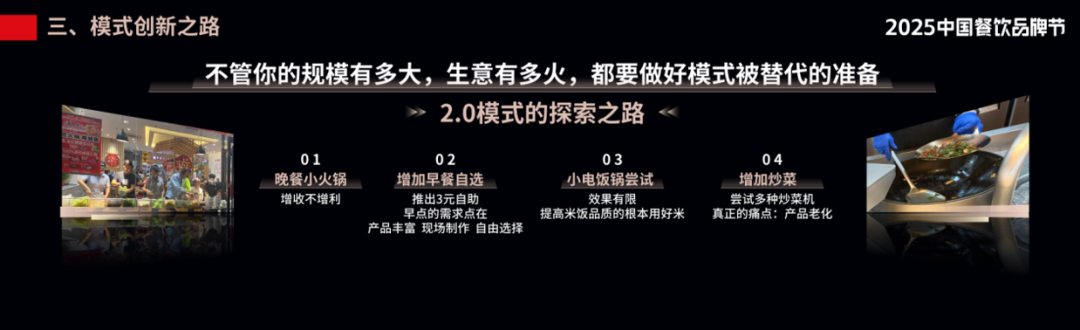 我們下一步就是2.0模型再升級(jí):升級(jí)炒菜機(jī)、價(jià)格帶拉升、打破菜系界限、不留戀老產(chǎn)品、外賣產(chǎn)品專治、環(huán)境干凈舒適、全時(shí)段經(jīng)營,現(xiàn)在已經(jīng)開始啟動(dòng)了。
