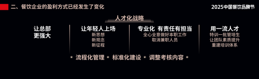 第五,餐飲業(yè)的人才化,現(xiàn)在餐飲的體系化作戰(zhàn),沒有人才是干不了的。