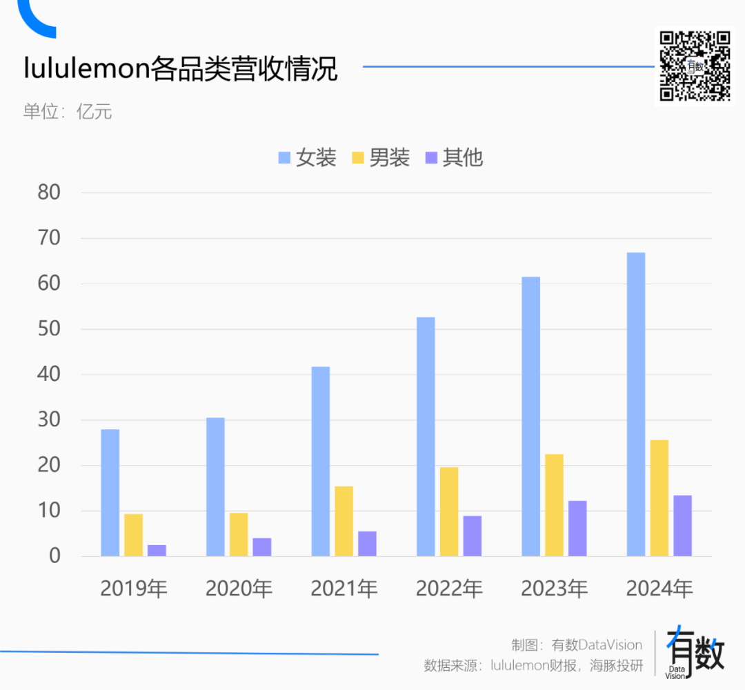 2019年到2024年,lululemon收入結(jié)構(gòu)中男裝占比從23.5%上漲到25.2%,幾乎可以忽略不計。
