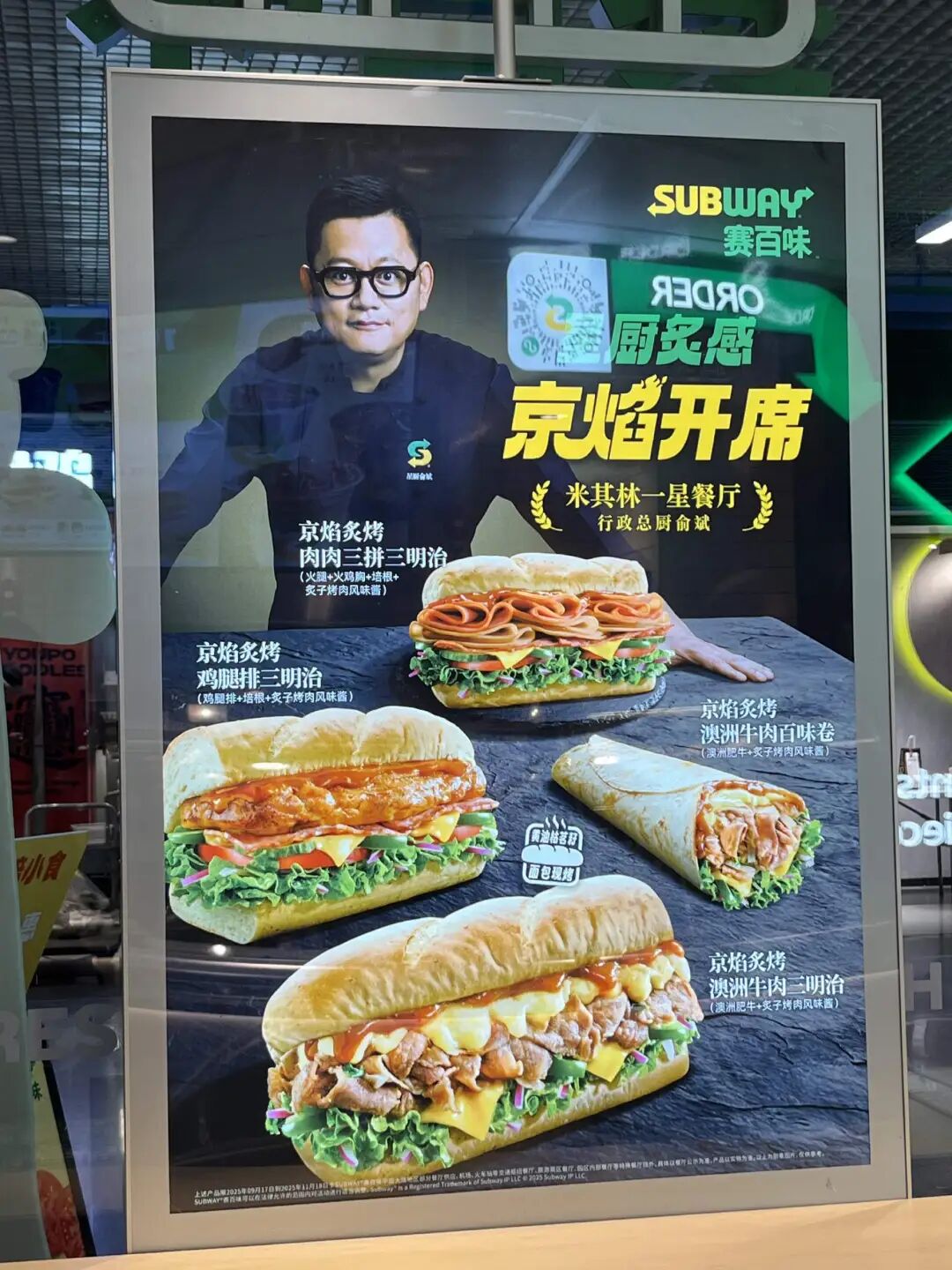 作為連鎖快餐,在國內“起個大早,趕個晚集”的賽百味在本土化之路上依舊“高端”。聯(lián)名米其林一星主廚,主廚還是做北京烤肉的。京味兒炙烤,依然是32塊錢半個。“像90年代的中華大飯店,做宣傳的唯一方式是門口立個海報,寫著本店菜品是米其林主廚傾情推薦!