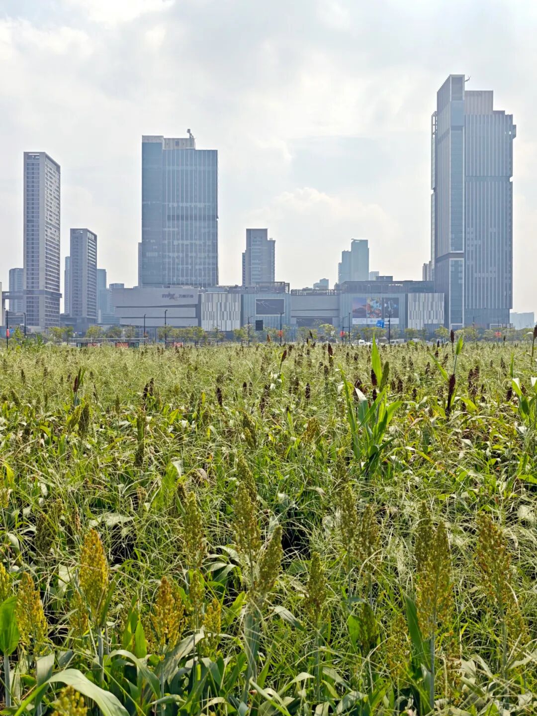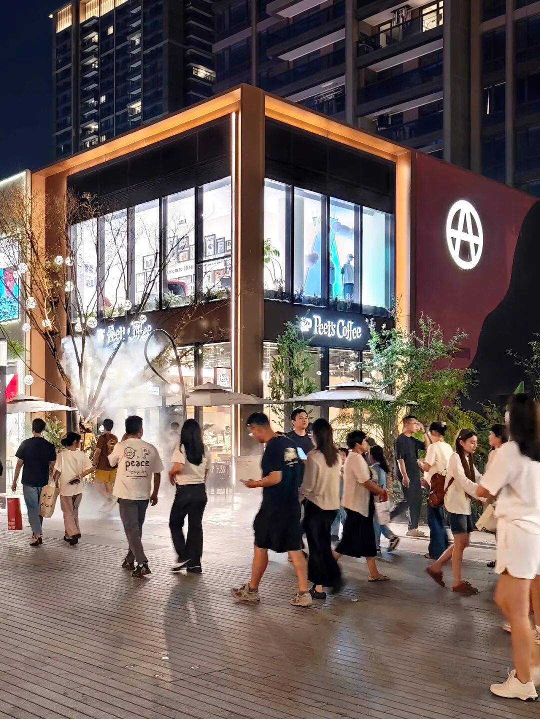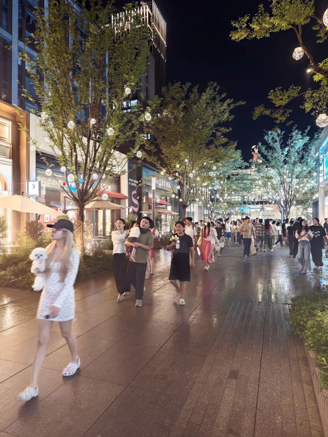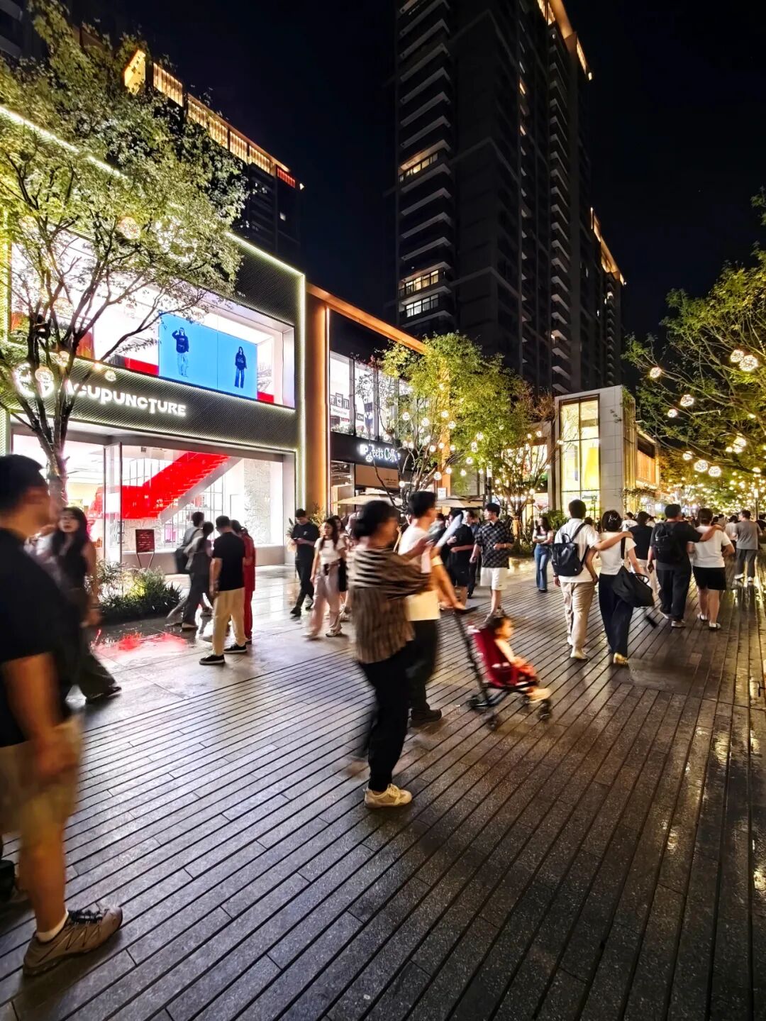 我們也有幸拍到視角從江邊越過大片農(nóng)田對(duì)望亞奧萬象天地的照片,且恰好在夜間遇見項(xiàng)目開業(yè)當(dāng)日的客流峰值。畢竟,人們都愿在舒適的夜間,迎著從江邊吹來的徐徐微風(fēng),來逛新商場特別是有chill氛圍的戶外街區(qū)。